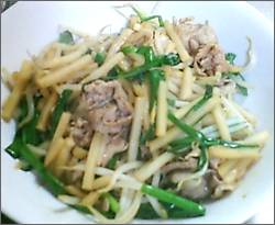 醤油ほんの少々、オイスターソース、ウェイパァ少々、味の素を入れてさらに火を通します。 完成直前でニラを入れ、軽ーく炒めます。