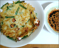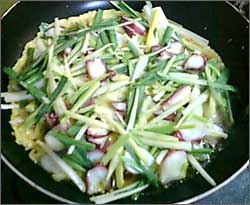 熱したフライパンにかなり多目の胡麻油を入れ、薄く伸ばして弱火で焼きます。