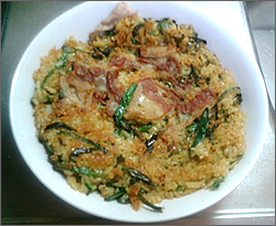 硬めに炊いた米に切ったニラと、ネギとチャーハンの素1袋と豚ロースと卵1個を入れて、よーく混ぜます。