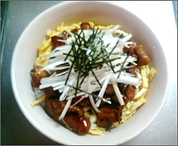 丼に盛ったご飯の上に錦糸玉子を敷き、その上に鶏を乗せ、白髪ねぎと刻み海苔をかけて完成。 適当に作った割にはすっげーうまい!!