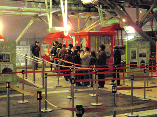 後でわかったのだが、人が並んでいる方は、ゴンドラがスケルトンになっている方。 誰も並んで無いほうは普通のゴンドラ。