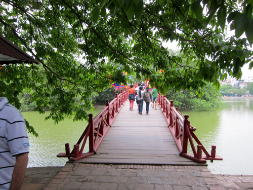さて、ホアンキエム湖に浮かぶ小島を結ぶ橋は赤いのでとても目立ち、且つ緑色の湖面にとても映える。