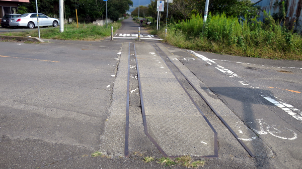 遮断機などは無いが、おそらくは踏み切り跡のレール痕!!